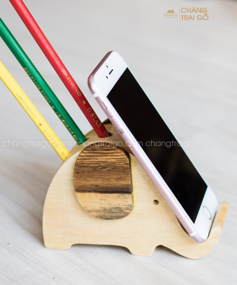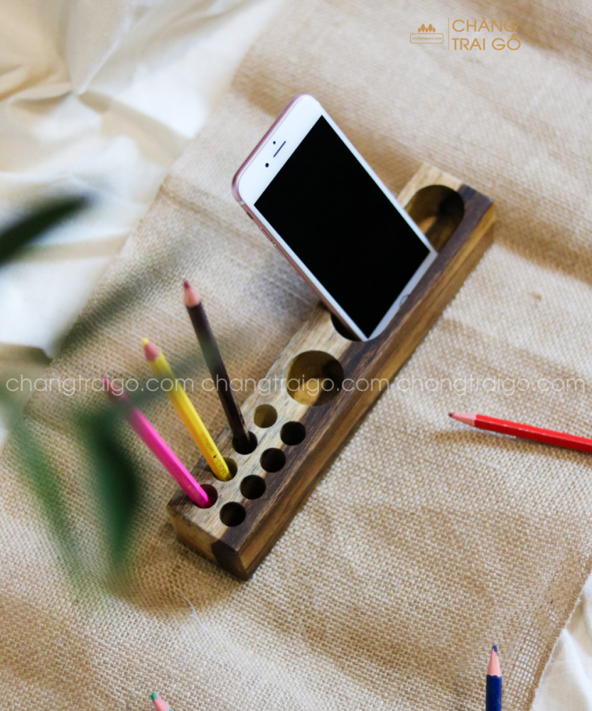 – Hộp gô cắm bút được Chàng Trai Gỗ thiết kế với 8 chỗ để bút, 1 chỗ để bút lông to, ô to còn lại để kê điện thoại hoặc name card.