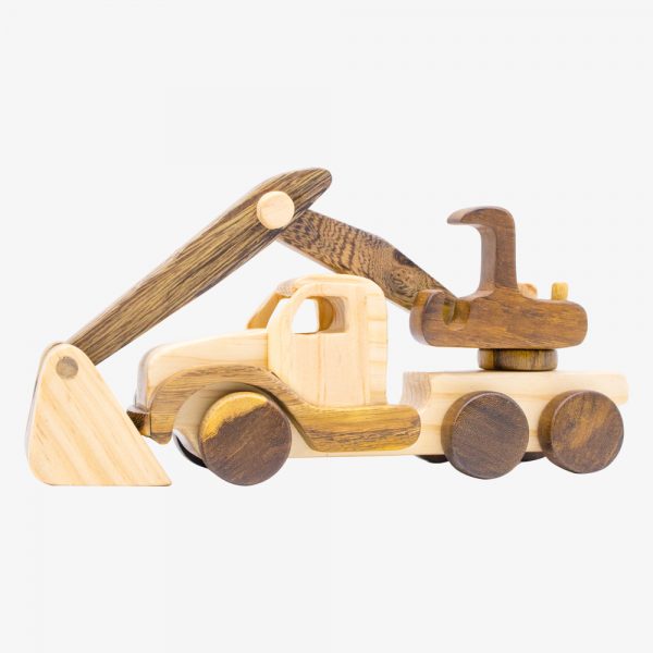 Cần cẩu được làm bằng gỗ tự nhiên. Nó có thể lăn được trên sàn, nó hoạt động như một máy móc xây dựng thực tế.